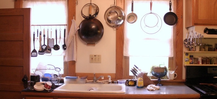 4. Store dishes and utensils in drawers and cupboards closest to the appliance with which they are most frequently used. Everyday tableware should be kept over the dishwasher, or in the cabinets next to the sink. Pots, pans, and skillets arranged in cupboards under or near the stove, or hung on hooks above the range, provide for speedy access both in tidying up and in cooking.